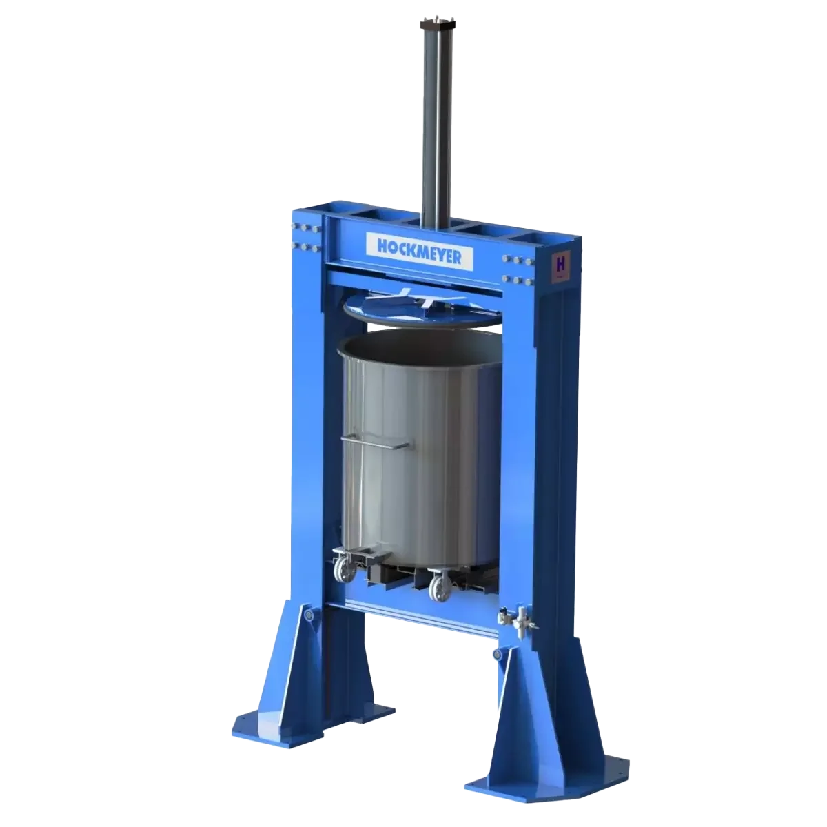 Vessels are wheeled under this style of press and locked into place. Then the base raises the vessel to an elevation that makes for convenient transfer, usually to smaller containers, as the product is hydraulically discharged. All of Hockmeyer’s presses are of heavy duty, durable construction.